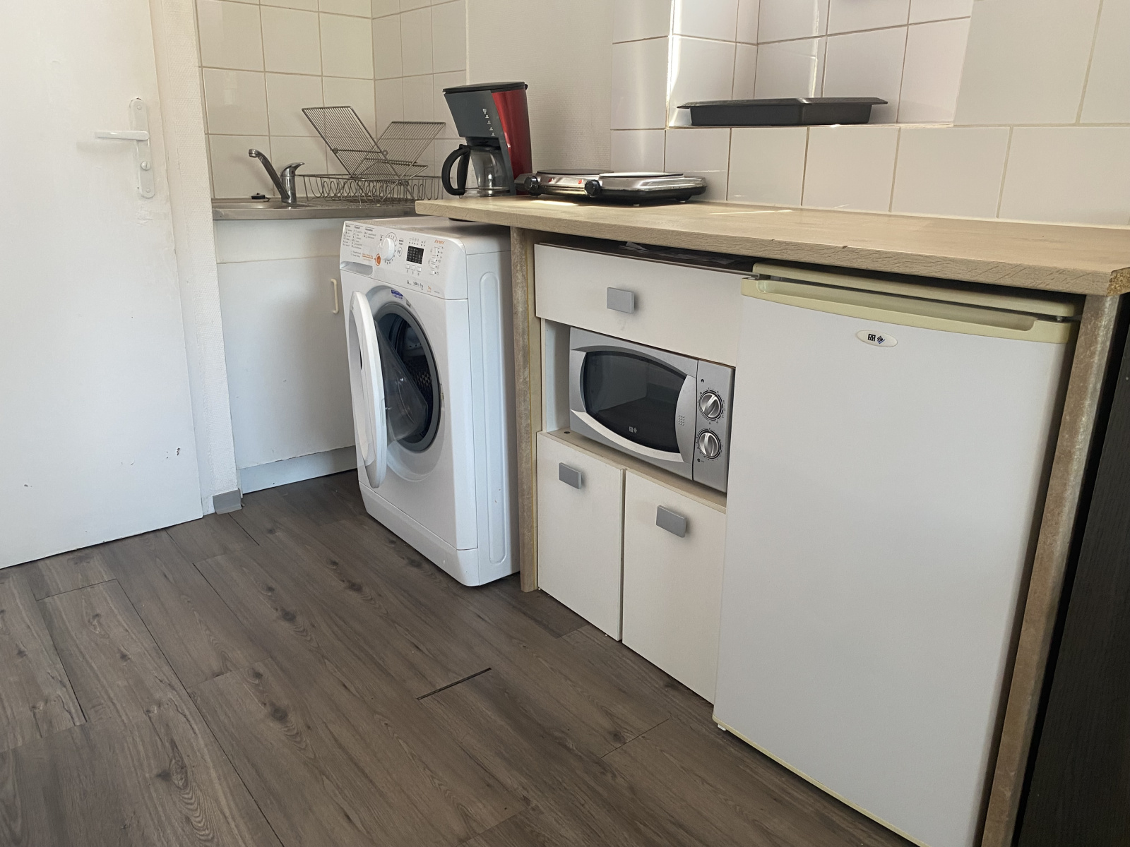 Il se compose d'un espace de vie de 14m² avec sa kitchenette équipée ( frigo, plaque électrique, micro-onde, cafetière et machine à laver) ainsi que sa salle d'eau/WC.